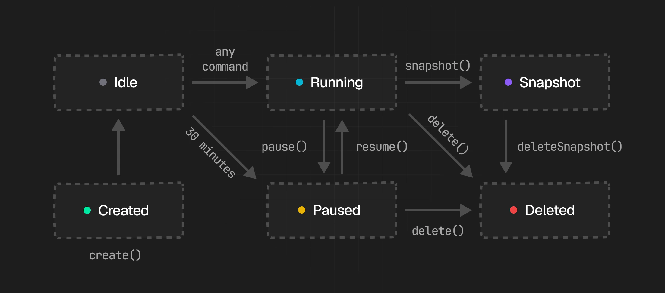 Snapshots capture the full workspace state of a box at a point in time. They let you checkpoint a working environment and later create a new box from that exact state. Learn more in Snapshots.5. Deleted