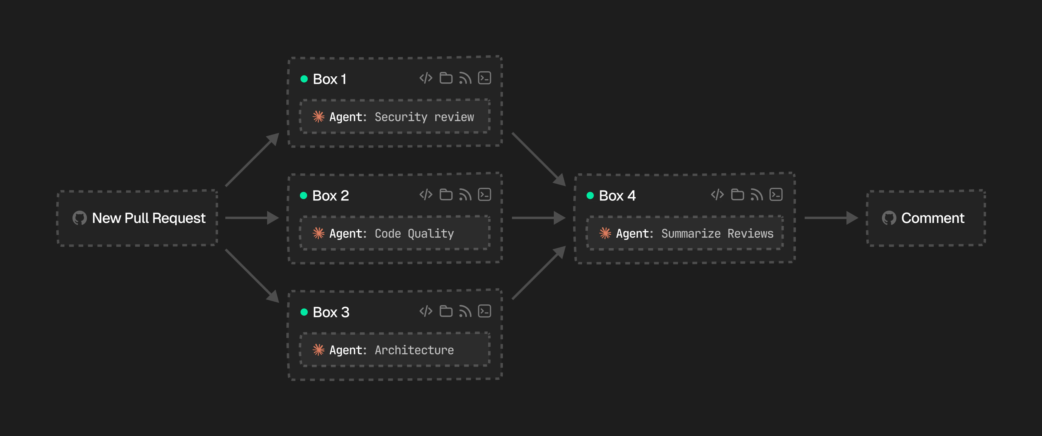 Box’s async SDK lets you spin up multiple boxes in parallel, each running a specialized agent with a distinct role. Once every agent finishes, a final box can synthesize their outputs into a single result.