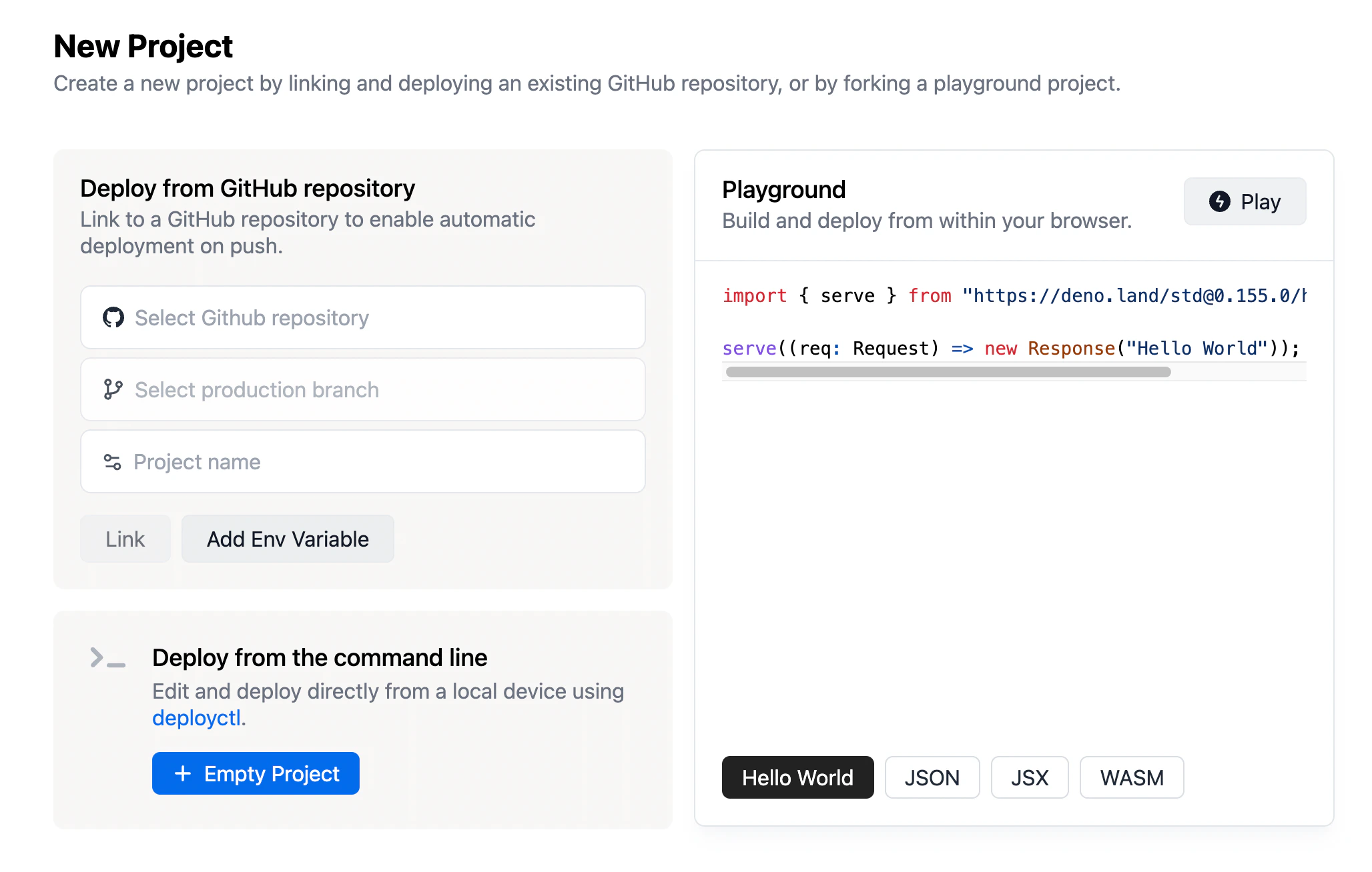 Go to https://dash.deno.com/projects and create a new playground project.