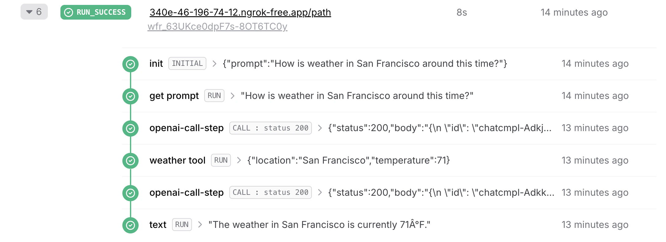 We can either run the app locally or deploy it. Once the app is running, we can trigger the workflow using the following code: